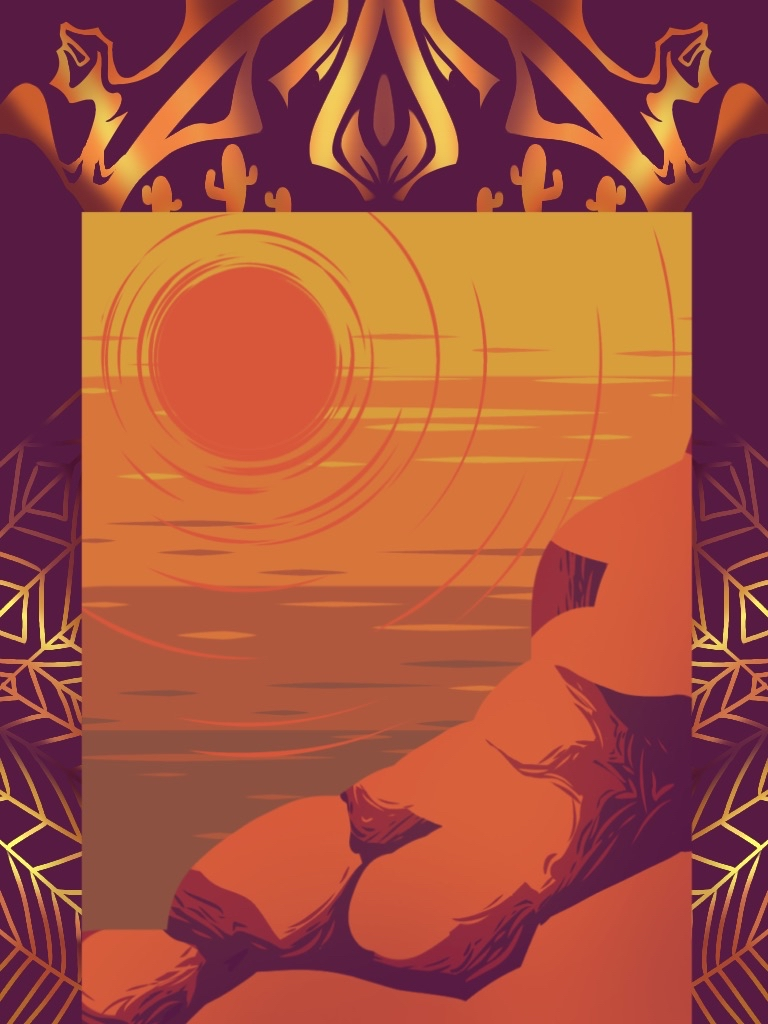 A digital painting of desert rocks in the sun. The color palette is mostly orange, shaded with purple.
