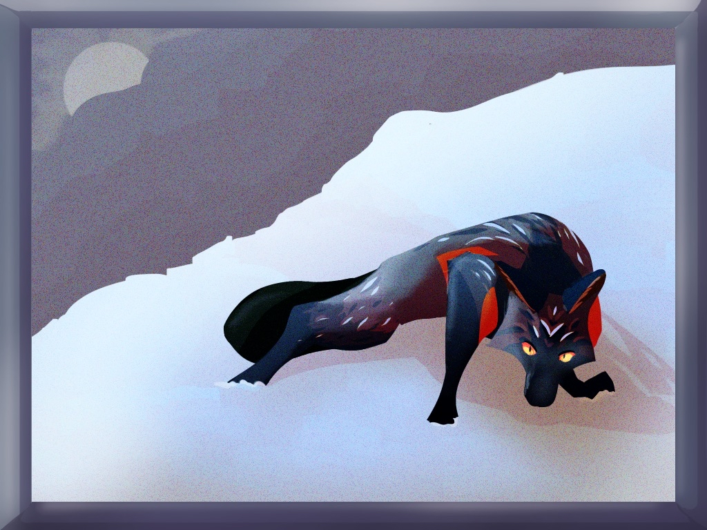 A digital painting of a gray fox crouching in the snow. The image has a gray frame and the moon is visible in the cloudy sky.