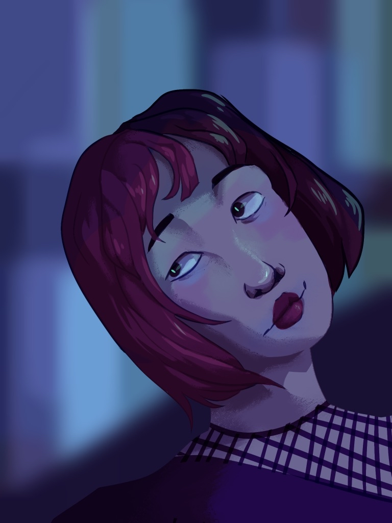 A digital bust drawing of an asian woman with medium-length red hair in neon lighting. She is wearing a mesh shirt.