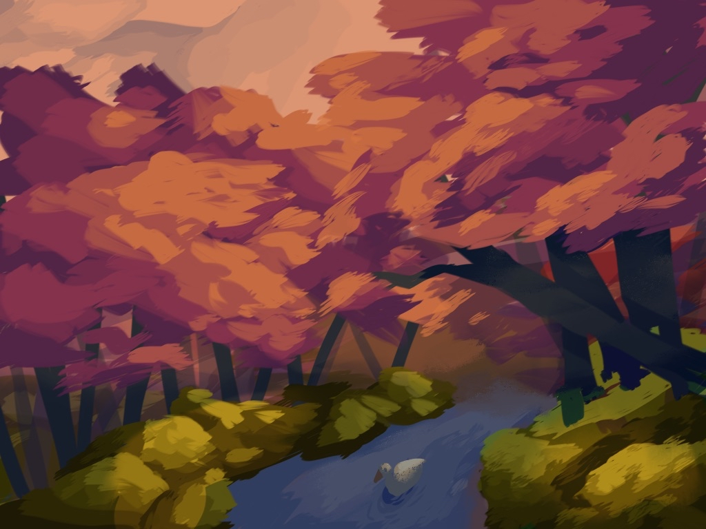A digital painting of a white duck swimming in a river that winds through an autumn forest. The color palette is made up of pinks, oranges, greens and blues.