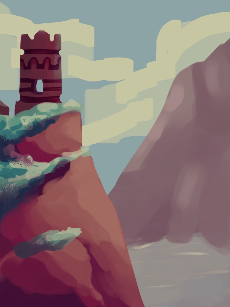 A digital painting of a brown castle-inspired tower on a grassy island, with the ocean and another island in the background. The sky is blue with white clouds.
